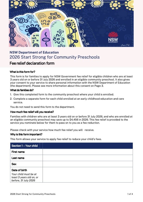 Upon enrolling at Sun Preschool, please let the Office know if you have signed this Fee Relief form at another preschool or long day care centre.